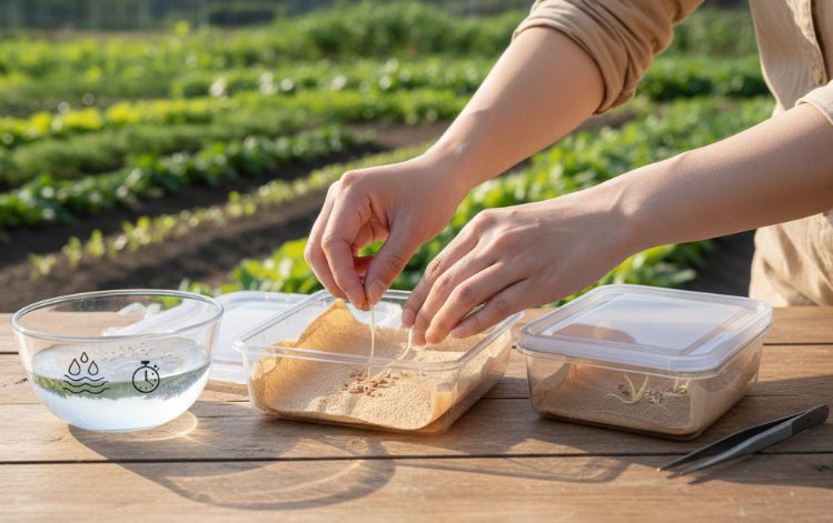 まず、浅い容器に人参の種を入れ、種が完全に浸るくらいの水を注ぎます。そのまま一晩(8〜12時間程度)静かに置いておきましょう。この工程で、硬い種皮に水分をじっくりと、しかし確実に吸収させることが目的です。